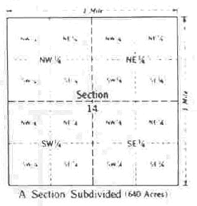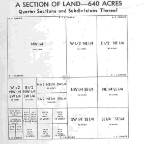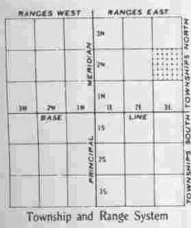 For example: A piece of land is described as the NE 1/4 of the SW 1/4 of Section 10, T 4-N, R 5-E, 3rd. Prin. Mer. The translation would be " The Northeast quarter of the Southwest quarter of Section 10 in Township 4 North and Range 5 West of the 3rd. Principal Meridian." By referring to the map the approximate location of this 40 acre tract can easily be determined.