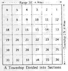 The township is 6 miles square. It is divided into 36 square-mile sections of 640 acres each which may be divided and subdivided as desired. The diagrams herewith show the system of numbering the sections and the usual method of subdividing them.